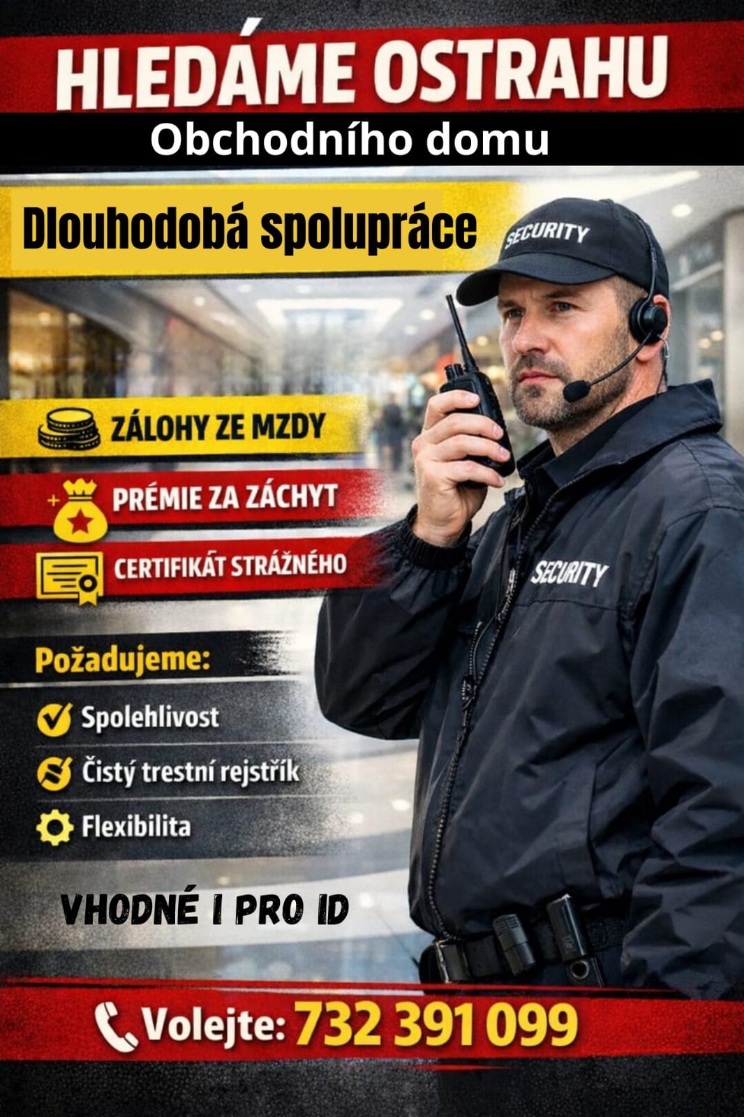 HLEDÁME PRACOVNÍKY OSTRAHY DO OBCHODNÍHO DOMU Máte čistý trestní rejstřík a chuť pracovat ? Přidejte se k nám do stabilního týmu. Jsme dlouhodobě zavedená bezpečnostní agentura, která poskytuje stabilní pracovní příležitosti. Hledáme nové kolegy/ně na pozici strážných. Věříme, že poctivost a odpovědný přístup jsou klíčem k úspěchu a pokud sdílíte naše hodnoty, jste pro nás ideální kandidát. Náplň práce: - kontrola prodejní plochy, pochůzka po obchodní jednotce - hlídání pokladní zóny - zabezpečování rizikového zboží - eliminace krádeží a nepoctivého jednání zákazníků - spolupráce se zaměstnanci prodejny, v případě nutnosti i s policií - aktivní pracovní nasazení - vedení jednoduché dokumentace Nabízíme: - flexibilní směny - řádné zaškolení a firemní uniformy - prémie za záchyt - možnost záloh ze mzdy - dlouhodobou spolupráci - získání certifikátu strážného - mzdu až 160Kč/hod - dobré vztahy na pracovišti Požadujeme: - čistý trestní rejstřík - věk 18+ - spolehlivost Práce je vhodná i pro invalidní důchodce, starobní důchodce a studenty.